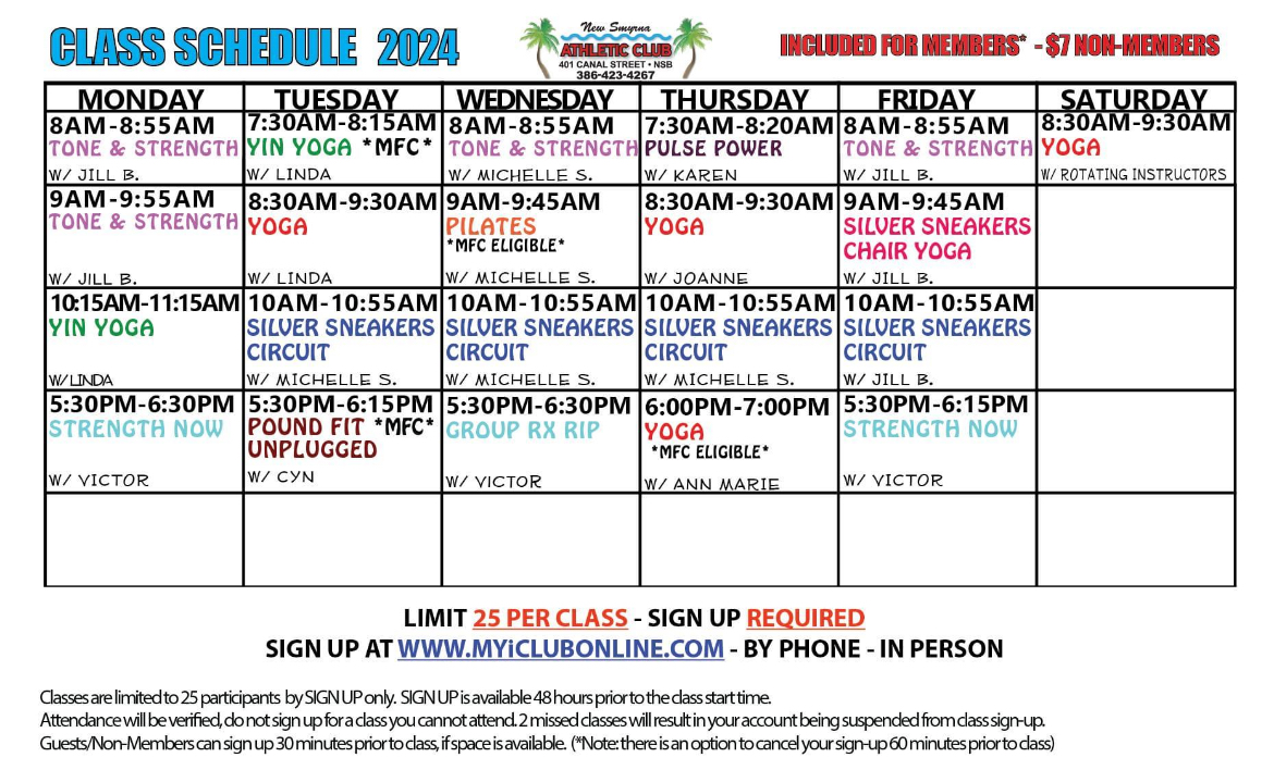 Our classes continue to be in extremely high demand and while we want to accommodate as many members as possible we are limited by the space, time slots and instructors available for these classes. We are fortunate to have excellent instructors and cannot over-burden them with multiple repeat classes per day. Members are able to sign up for class 48 hours ahead of time by going to MyiClubOnline.com- if a class is full there is an option to be put on the notification list which will automatically NOTIFY you by EMAIL if there is a spot that has opened up. You are still responsible to enroll in that open space, even if you are on the notification list. All spots are available on a first come first serve basis, including opened spaces on the notification list. Calling and leaving a voicemail to be signed up for class also does not guarantee a place in that class, as our voicemail is checked during business hours and all spaces in those classes will likely have been taken by members signing up online - which is the most efficient and effective way to sign up for classes. Non-members and/or guests have to inquire no sooner than 30 minutes before a class is to start if there are any spaces available. We have also added a special 45 minute Pulse Power class on Thursday mornings which we encourage all members to try. Our most up to date class schedule is available here.