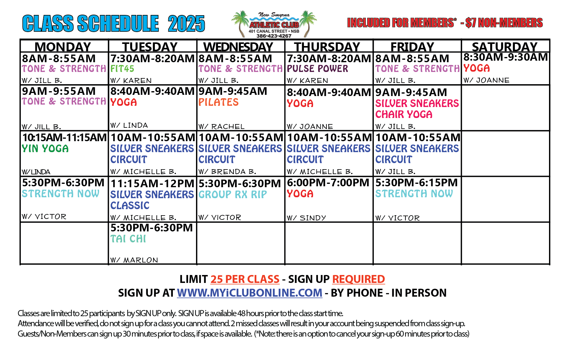 Please keep an eye on our class schedule as we make some changes over the Spring/Summer. Check on Facebook, myiClubOnline or our website for the most up to date schedule. Classes do still remain in HIGH demand, and we recognize it can be frustrating when you are unable to register for a class, but their availability will always be on a first come, first serve basis. All active members of the club - regardless if you have signed up for 1 month or 1 year, will be given an equal opportunity to attend our classes. NSAC offers the MOST FREE classes in the area. Please thank your instructors for making themselves available and for the hard work they put into teaching classes at the club, it can be very difficult and stressful on them at times. We understand more classes would be great, but we are limited by space, time slots and available instructors. Members are able to sign up for class 48 hours ahead of time by going to MyiClubOnline.com - if a class is full, you will need to check if a spot has opened up regularly. The waitlist has been DISCONTINUED. If you are not registered for a class, you will NOT be able to attend. All spots are available on a first come first serve basis - regardless of membership types. Calling and leaving a voicemail to be signed up for class also DOES NOT reserve a place in that class, as our voicemail is checked during business hours and all spaces in those classes will likely have been taken by members signing up online - which is the most efficient and effective way to sign up for classes.