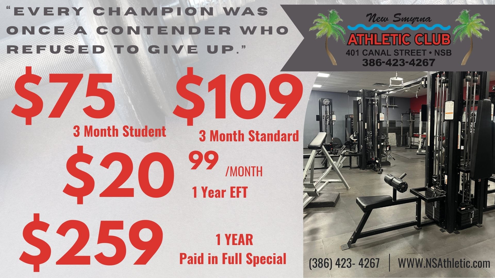 For any students that have finished their semester and have come home for summer break, we offer a special student rate of 3 months for only $75 as well as our regular student rate of $28.50/month (taxes included). Or if you have friends/family that are moving into the area and are looking for a new gym to stay in shape, we do offer a ONE WEEK FREE to any new Volusia County Residents that have never been members at the club.