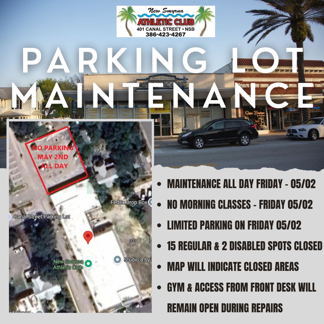 Finally, we will be conducting some parking lot maintenance on May 2nd. This will result in all morning classes being cancelled on this day and the closure of 17 spaces (15 regular, 2 disabled) closest to the front desk of the club for the duration of May 2nd, to reopen at 8am on Saturday May 3rd. There are many pot holes in this parking area that need to be filled and this is the best opportunity to get this taken care of with minimal disruption to the club. The club will remain open, 24/7 - just parking will be more limited on this day. We appreciate your understanding with this matter.