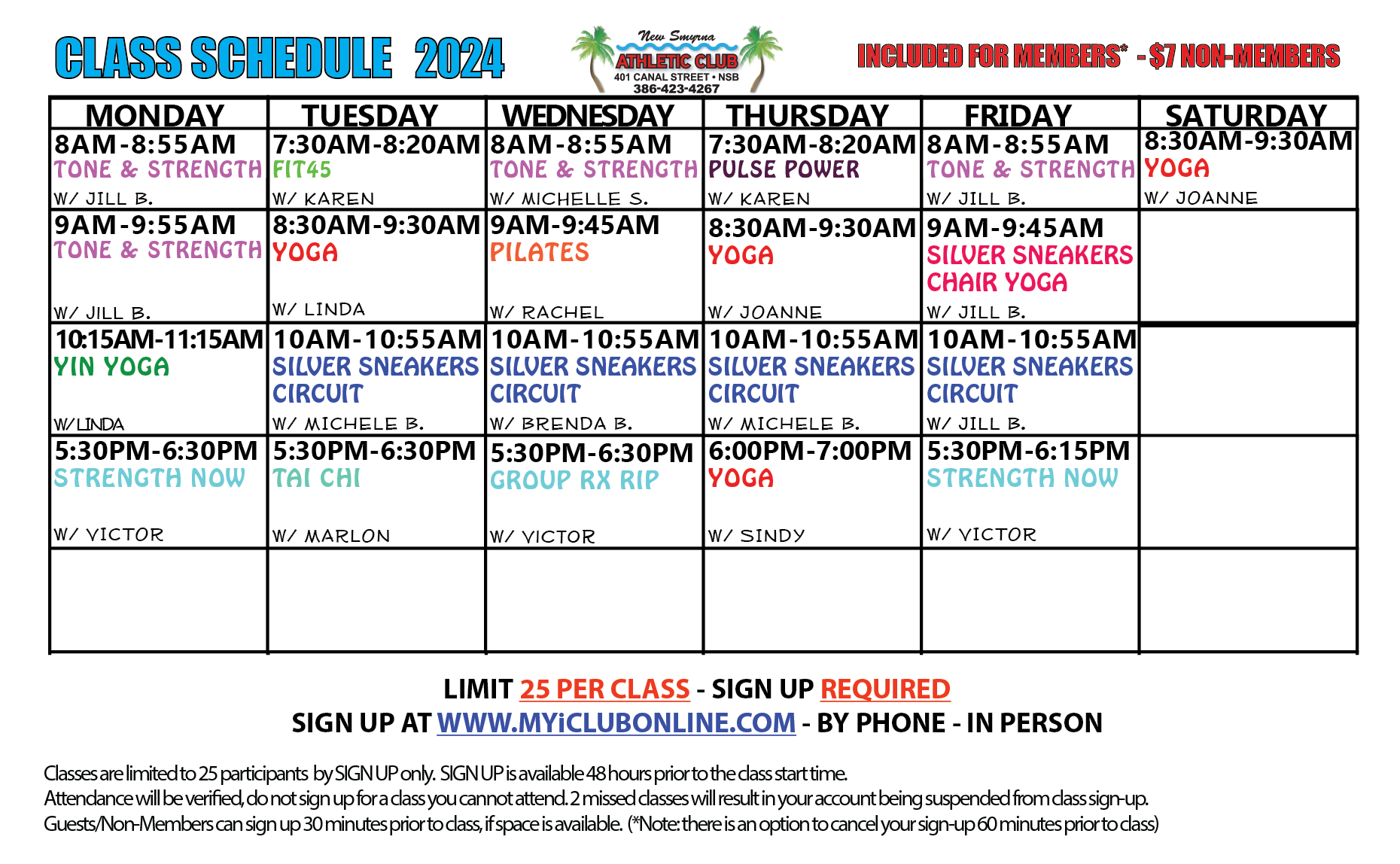 For those that attend our classes, this is a very important reminder that during the winter months classes fill up, and they fill up fast. Members are able to sign up for class 48 hours ahead of time by going to MyiClubOnline.com- if a class is full there is an option to be put on the Waitlist which will automatically NOTIFY BY EMAIL you if there is a spot that has opened up. You are still responsible to enroll in that open space, even if you are on the waitlist. If you see a space open up in a class and you are NOT on the waitlist, you cannot sign up for that class, so if you see a waitlist opportunity - place yourself on it. All spots are available on a first come first serve basis. We cannot guarantee you a space in a class if you attempt to walk in on the day of class, especially during the busy time of year. Calling and leaving a voicemail to be signed up for class also does not guarantee a place in that class, as our voicemail is only checked during business hours and all spaces in those classes could have been taken by members signing up online. Non-members and/or guests have to inquire no sooner than 30 minutes before a class is to start if there are any spaces available.