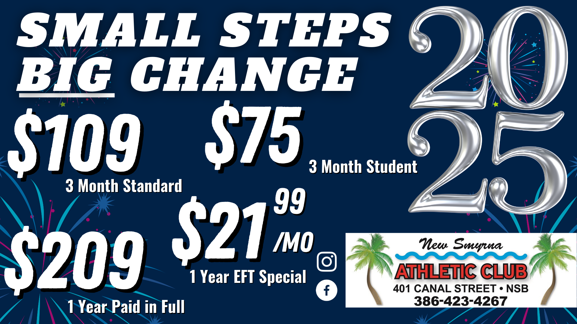 New Smyrna Athletic Club staff, instructors, trainers, and massage therapists all want to wish you a Happy & Healthy New Year and truly hope you have wonderful holidays - for all our members, future members and past members. January is a very busy time here at the gym and we appreciate your understanding while others are working towards their goals in the New Year. As far as parking is concerned, we experience congestion during class change over times, so if your schedule allows you the opportunity, it’s best to work out between 11:15am-3:30pm, or anytime after 7pm during the week. Parking is also available on Canal St or on any of the sides streets around the gym.