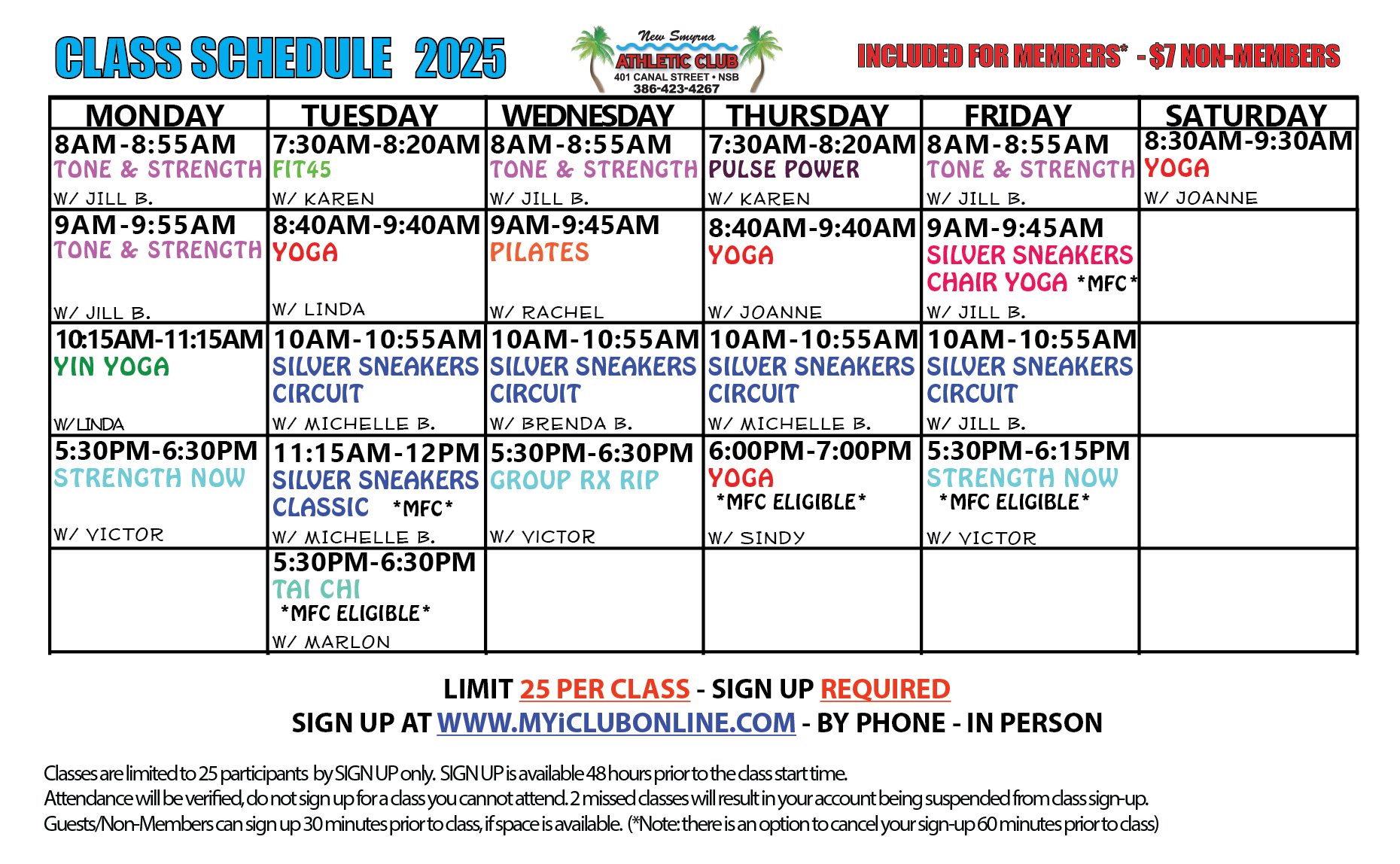 We have added a few additional classes and adjusted the start time for a couple - we appreciate that our classes are in HIGH demand and it can be frustrating when you are unable to register for a class, but their availability will always be on a first come, first serve basis. All active members of the club - regardless if you have signed up for 1 month or 1 year, will be given an equal opportunity to attend our classes. As a reminder, we offer the MOST classes in the area for the BEST price (Free of Charge) to all active members. We are very grateful for our instructors, their patience, their availability and the hard work they put into offering these classes to our members. As much as we would love to ask more of them, we unfortunately do not have enough time in the day, or space in our classroom to have more classes. While we want to accommodate as many members as possible we are limited by the space, time slots and instructors available for these classes. Members are able to sign up for class 48 hours ahead of time by going to MyiClubOnline.com- if a class is full, you will need to check if a spot has opened up, we have DISCONTINUED THE WAITLIST to avoid confusion. If you are not registered for a class, you will NOT be able to attend. All spots are available on a first come first serve basis - regardless of membership types, length of membership or seasonality. Calling and leaving a voicemail to be signed up for class also DOES NOT guarantee a place in that class, as our voicemail is checked during business hours and all spaces in those classes will likely have been taken by members signing up online - which is the most efficient and effective way to sign up for classes. Non-members and/or guests have to inquire no sooner than 30 minutes before a class is to start if there are any spaces available.