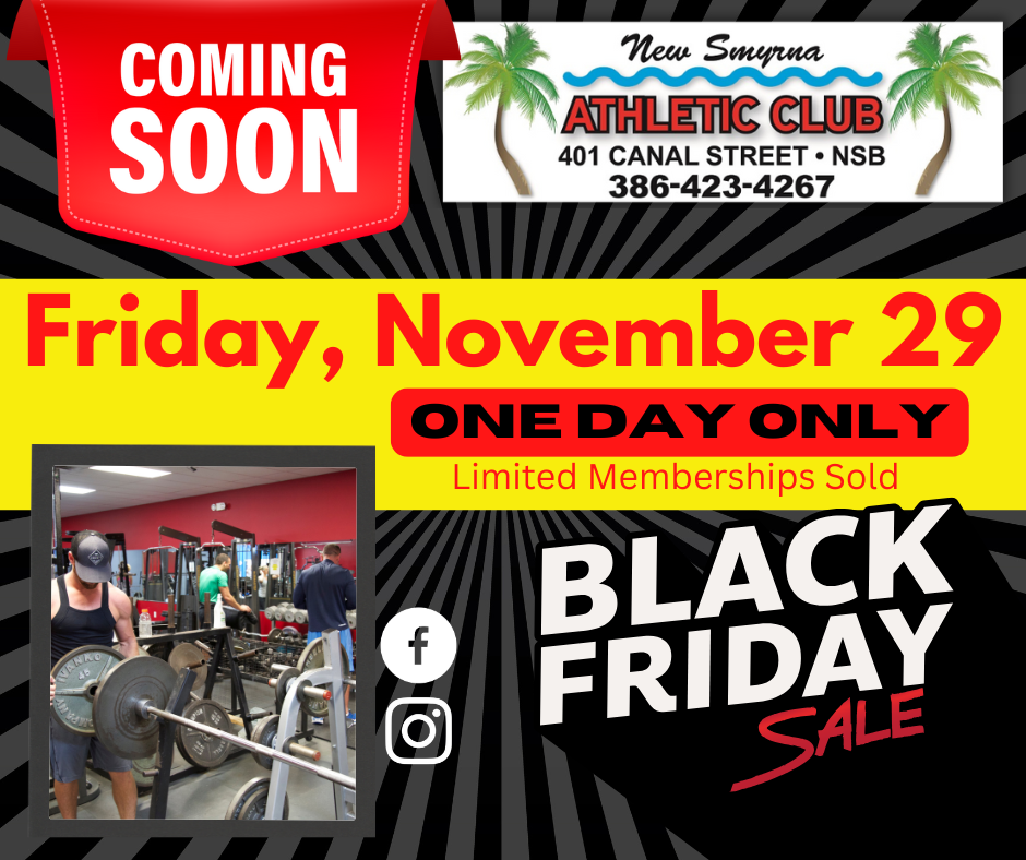 The holidays are quickly approaching, we will continue to run our annual Black Friday Sale on Friday, November 29th starting at 8:00am. We will continue to offer our Buy 1 Get 1 Free Special. Please let your friends and family know about your local gym and our one day only special - if they're looking for a gym, this is the best time of year to get our very best pricing. If you're not in town for our special this year you can always CALL (386-423-4267), EMAIL (accounts@nsathletic.com), message us on Facebook (New Smyrna Athletic Club) or have someone drop by on your behalf to take advantage of our one day only specials.